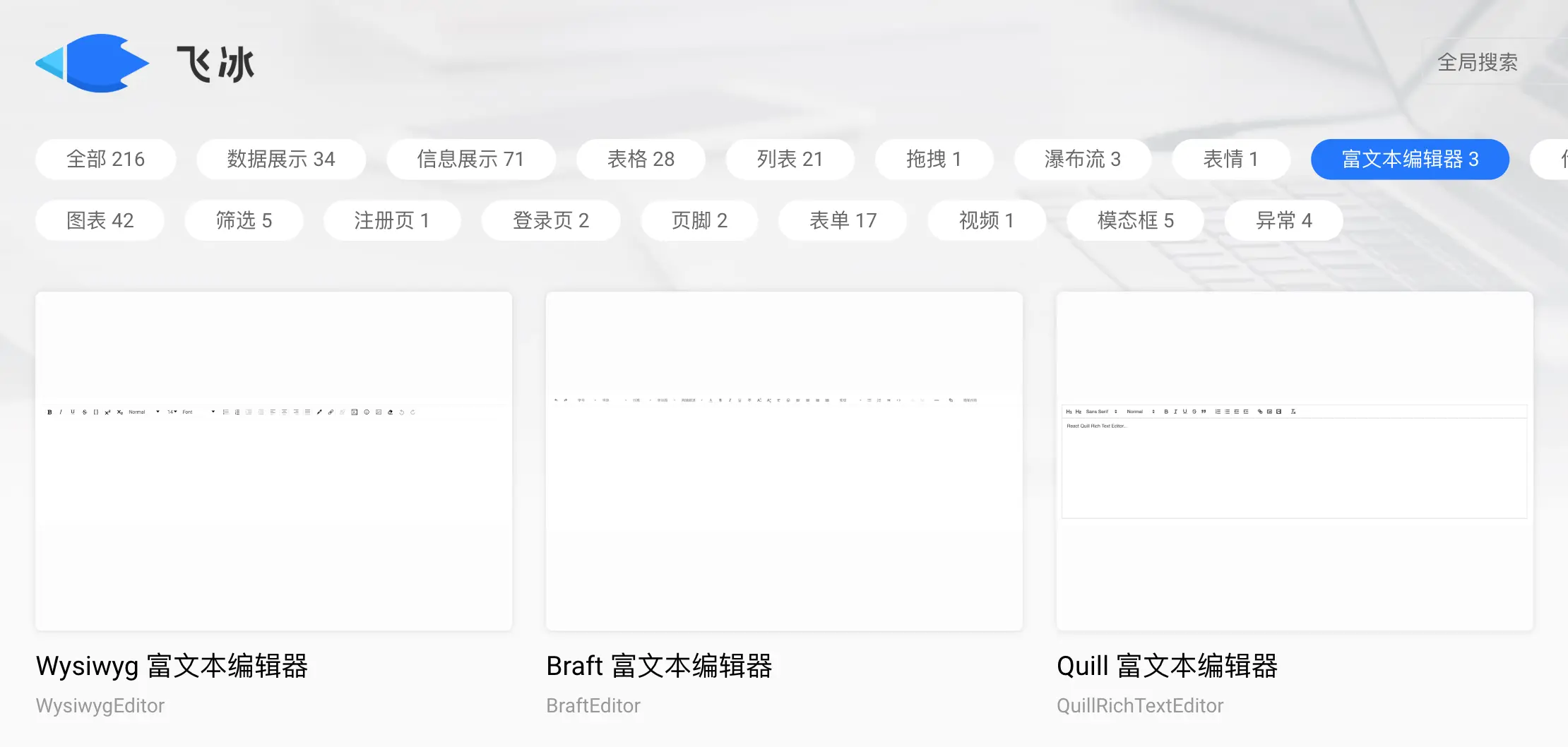 打比方我现在项目需要富文本编辑器,可以看到区块里提供了三款编辑器可供选择