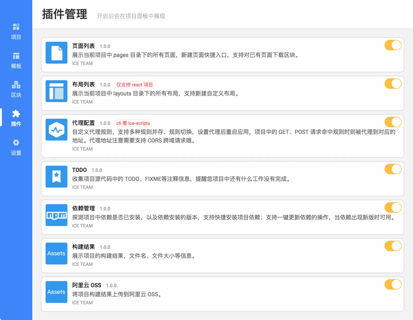 切换到模板标签可以看到飞冰目前提供的脚手架列表: