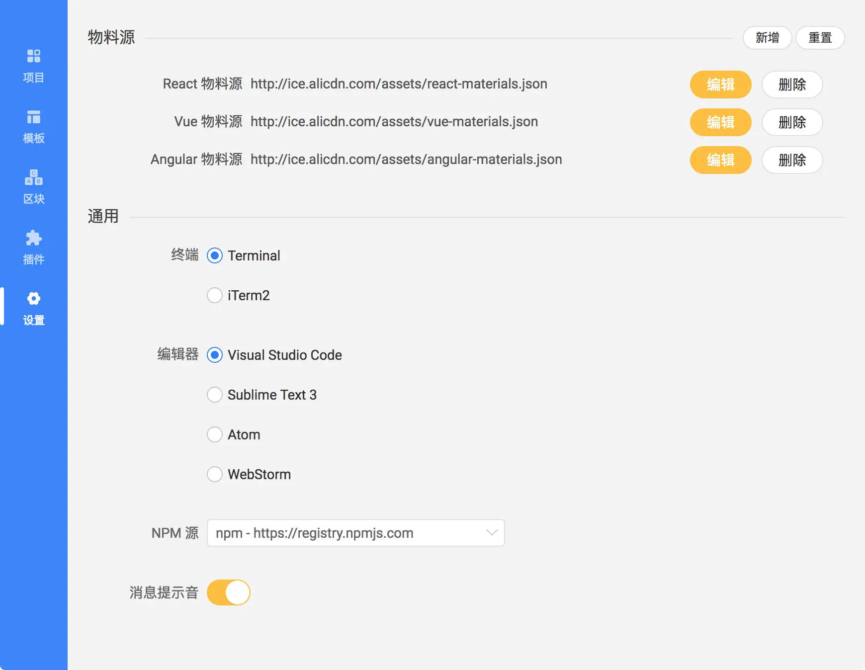 目前为止 ICE 已经支持 react vue Angular 三大主流框架的物料资源