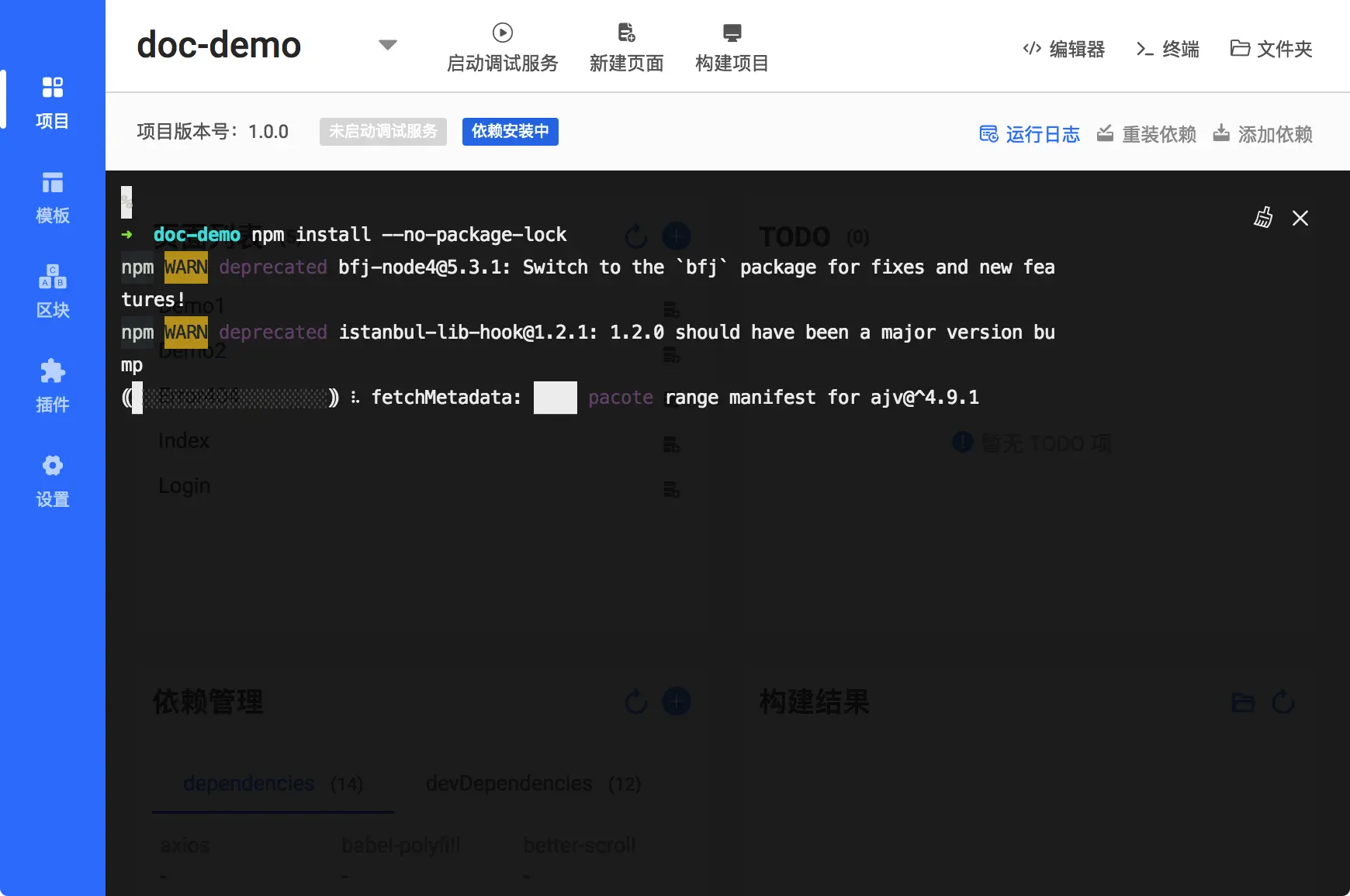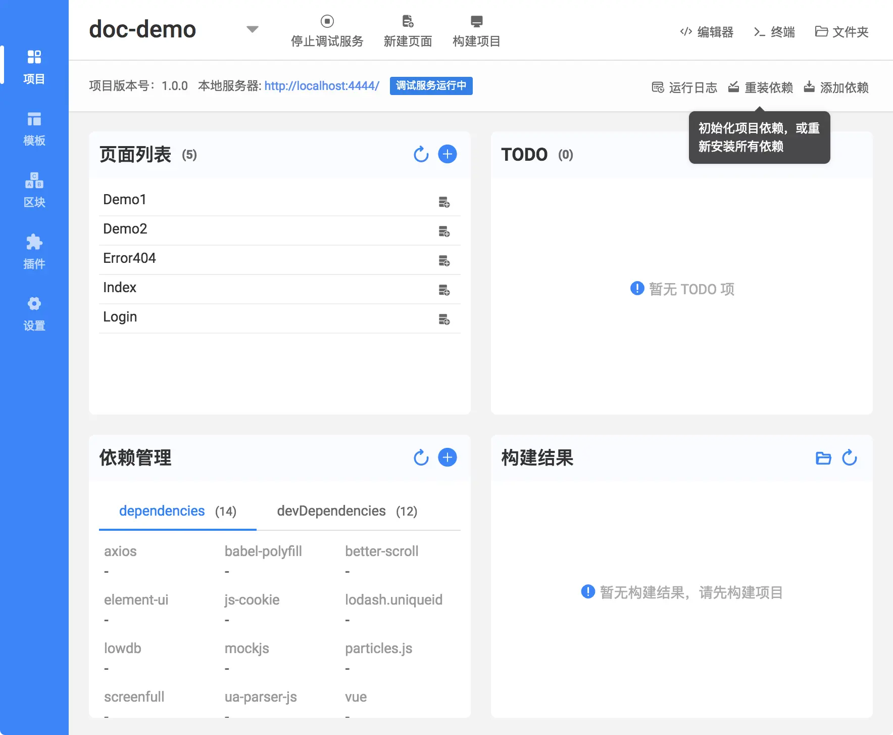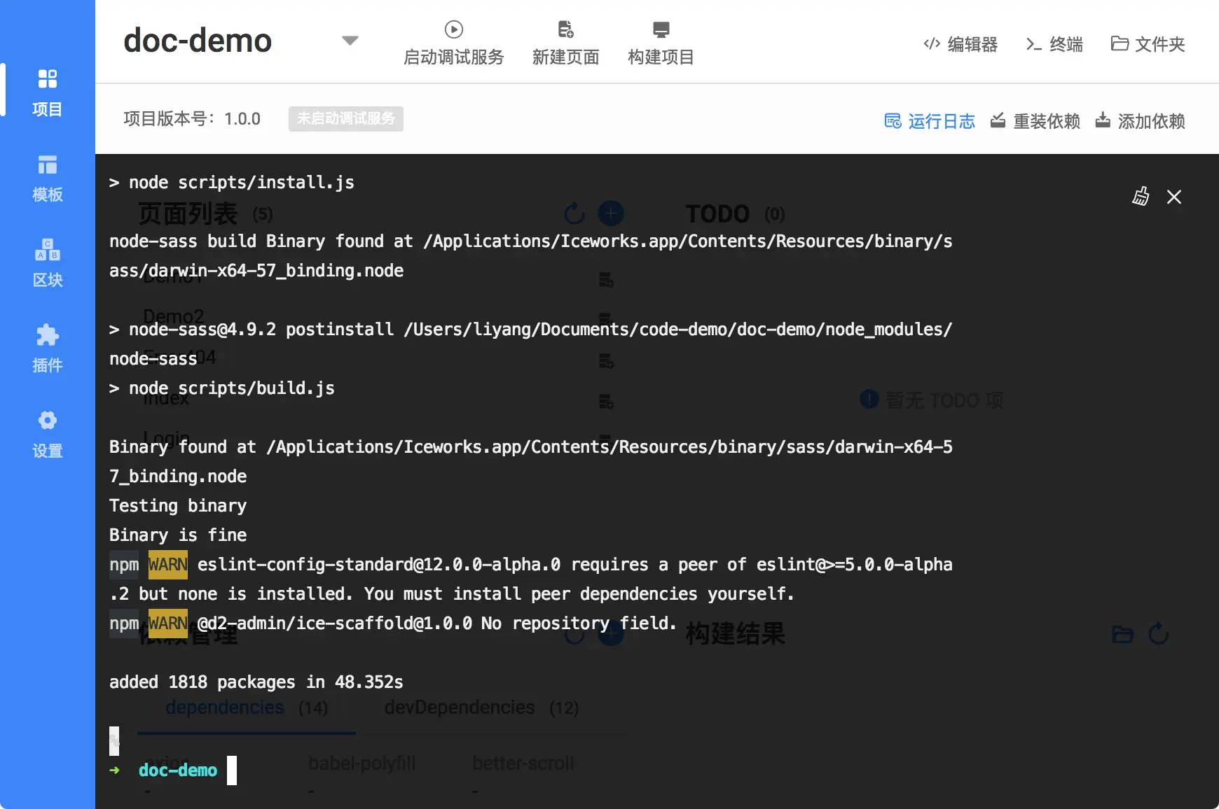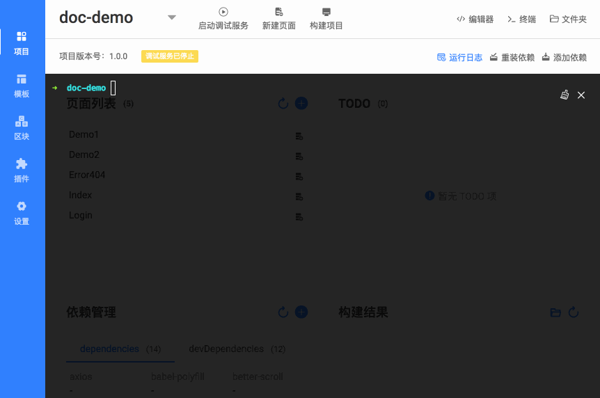 关闭 ICE 内集成的终端后可以看到项目面板,可以显示出现在有哪些页面,安装了哪些依赖等: