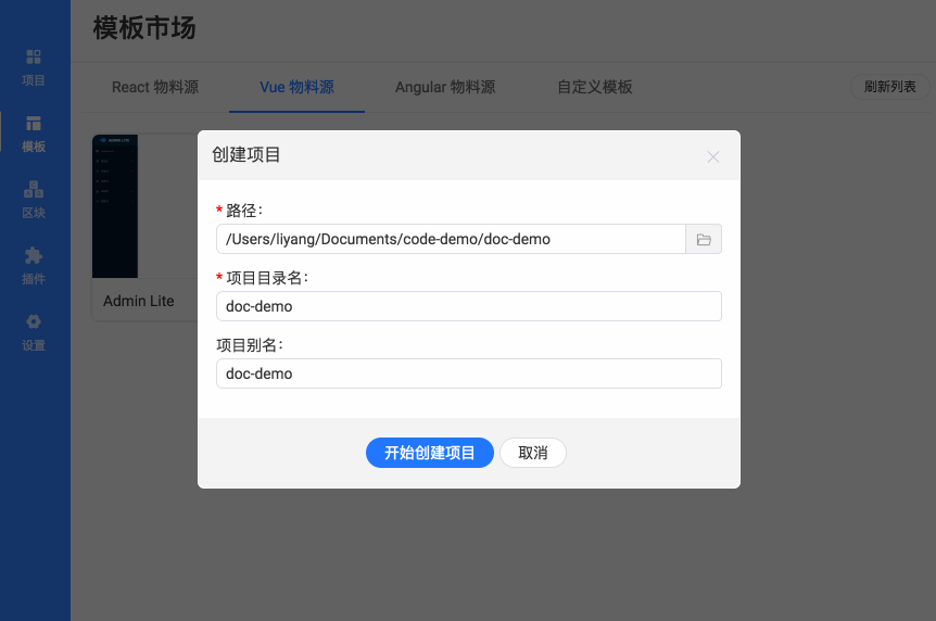 选择 D2Admin ICE 作为起始模板后会让我们填写项目保存地址: