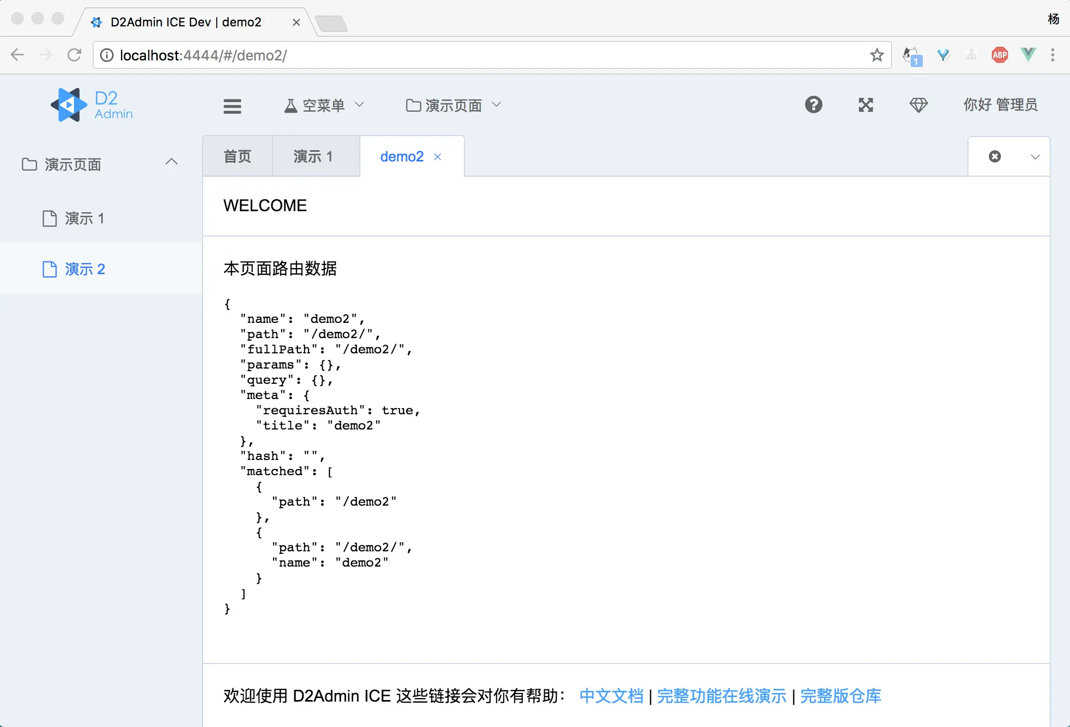 D2Admin ICE 实质上是 d2-admin-start-kit 的特别版本,为适应 ICE 的逻辑修改了一部分代码,可以看到模板十分干净,没有了任何完整版的示例 demo: