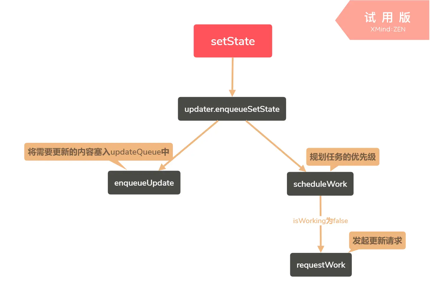 如果此时isWorking为true,react将不会立即执行更新操作,而是把更新操作交给正在working的任务。(例如:由onClick触发的working)