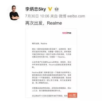 7月30日,OPPO前高管李炳忠发布了一则长微博,宣布自己创立的手机品牌Realme将正式独立。