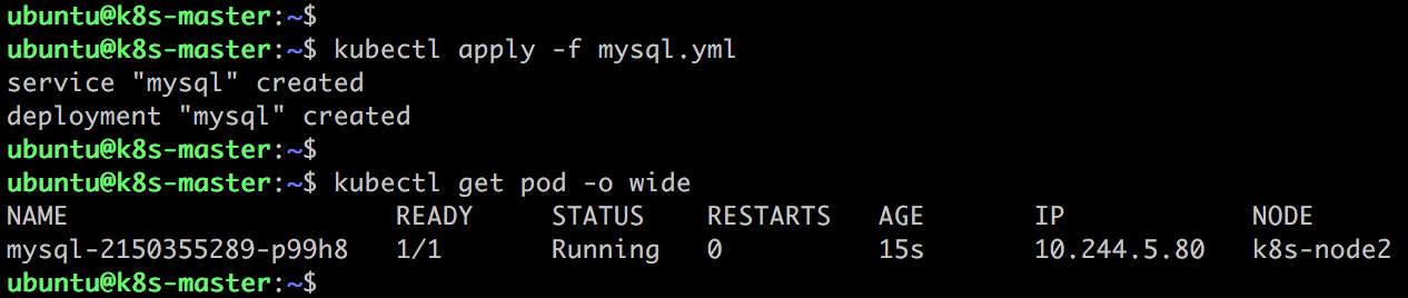 PVC mysql-pvc Bound 的 PV mysql-pv 将被 mount 到 MySQL 的数据目录 var/lib/mysql 。