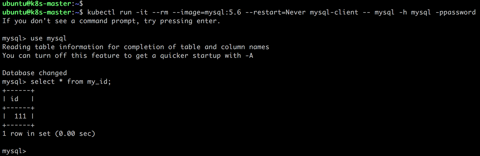 kubectl run -it --rm --image=mysql:5.6 --restart=Never mysql-client -- mysql -h mysql -ppassword