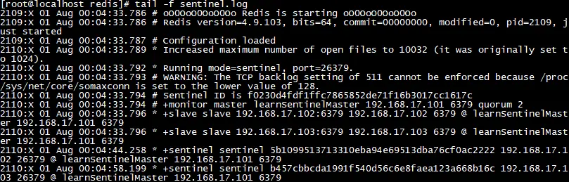 哨兵集群搭建完毕后,日志内容如下