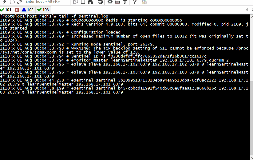 2101:X 31 Jul 19:13:35.793 # +selected-slave slave 192.168.17.102:6379 192.168.17.102 6379 @ learnSentinelMaster 192.168.17.101 6379
