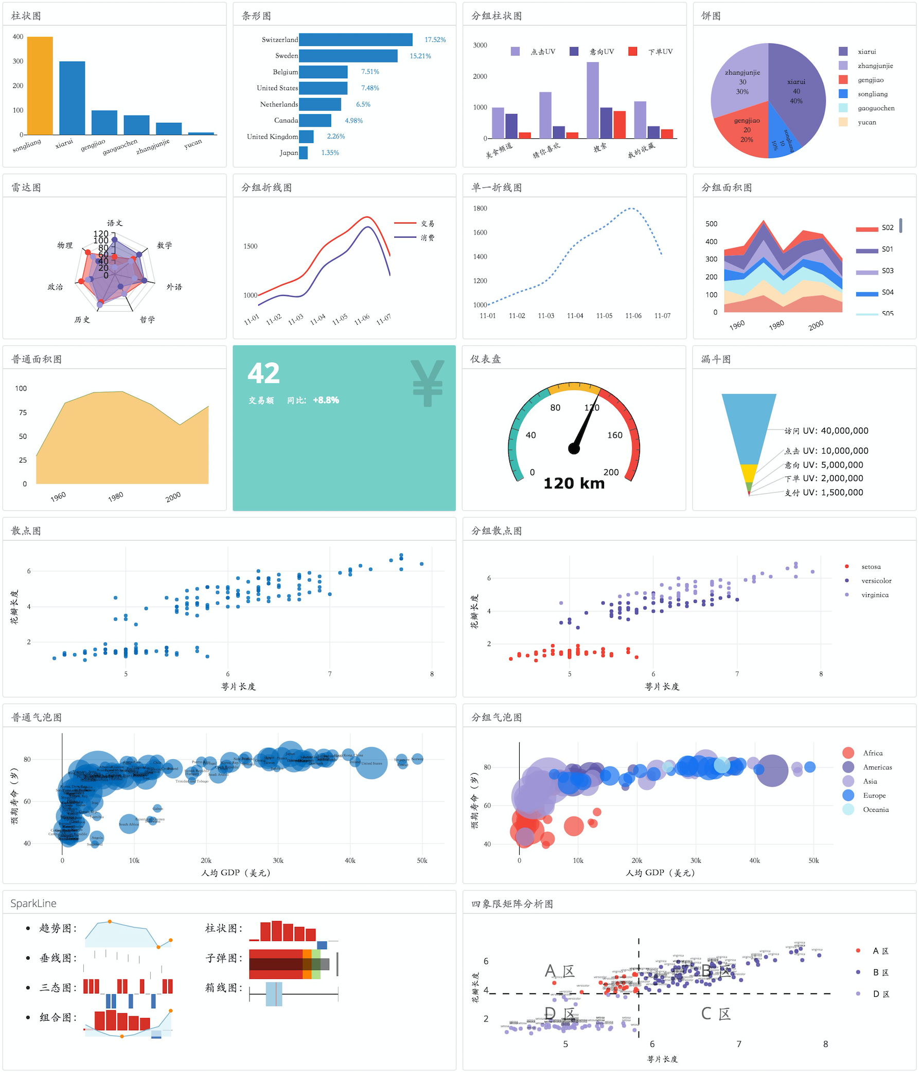实际数据运营分析过程中,可以固化常规的图表展现和可视化分析过程,实现代码复用,提高开发效率。下图是美团到店餐饮技术部数据团队积累的部分可视化组件示例: