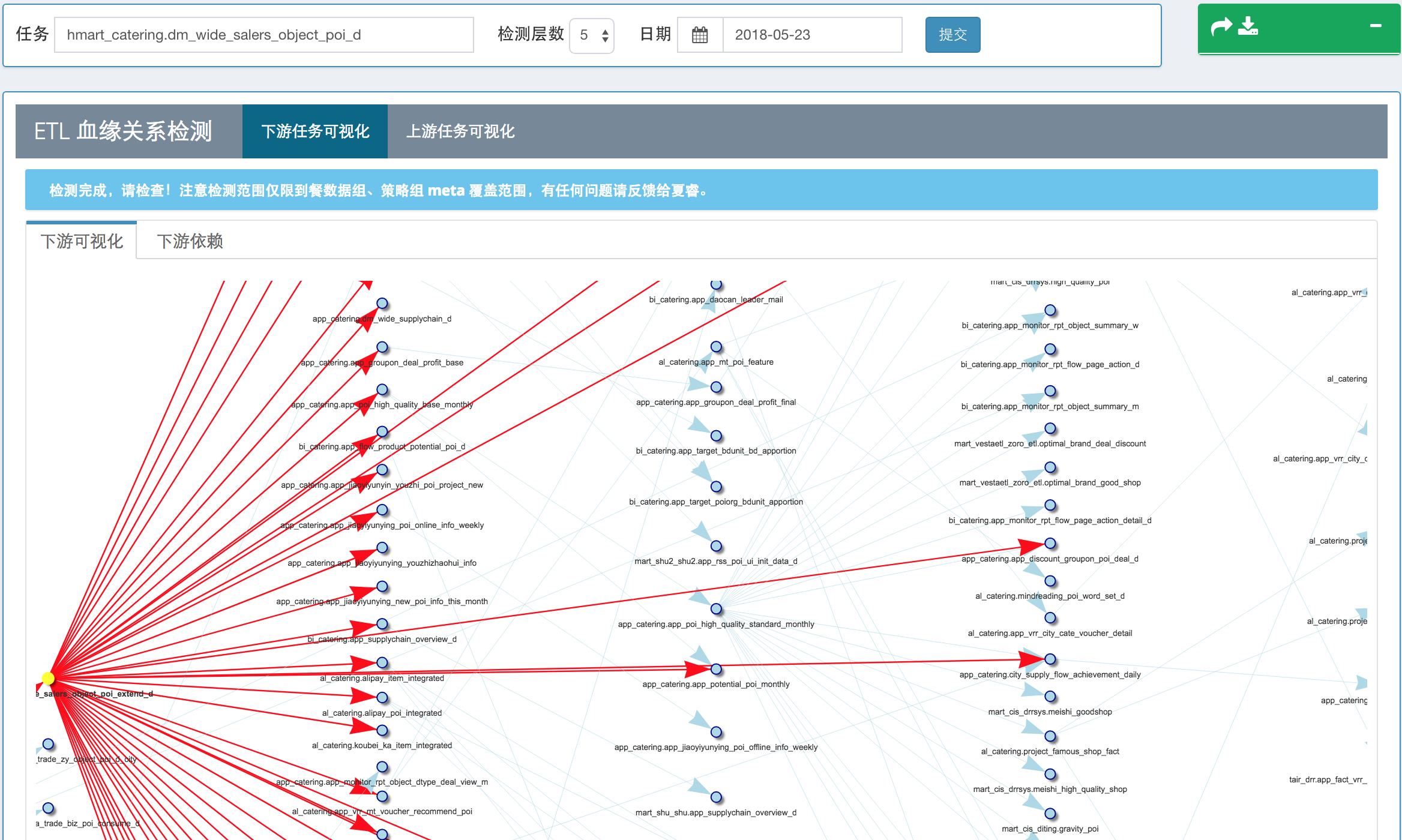 下图是美团到店餐饮数据团队在数据治理过程中,使用 R 开发的 ETL 间依赖关系可视化工具: