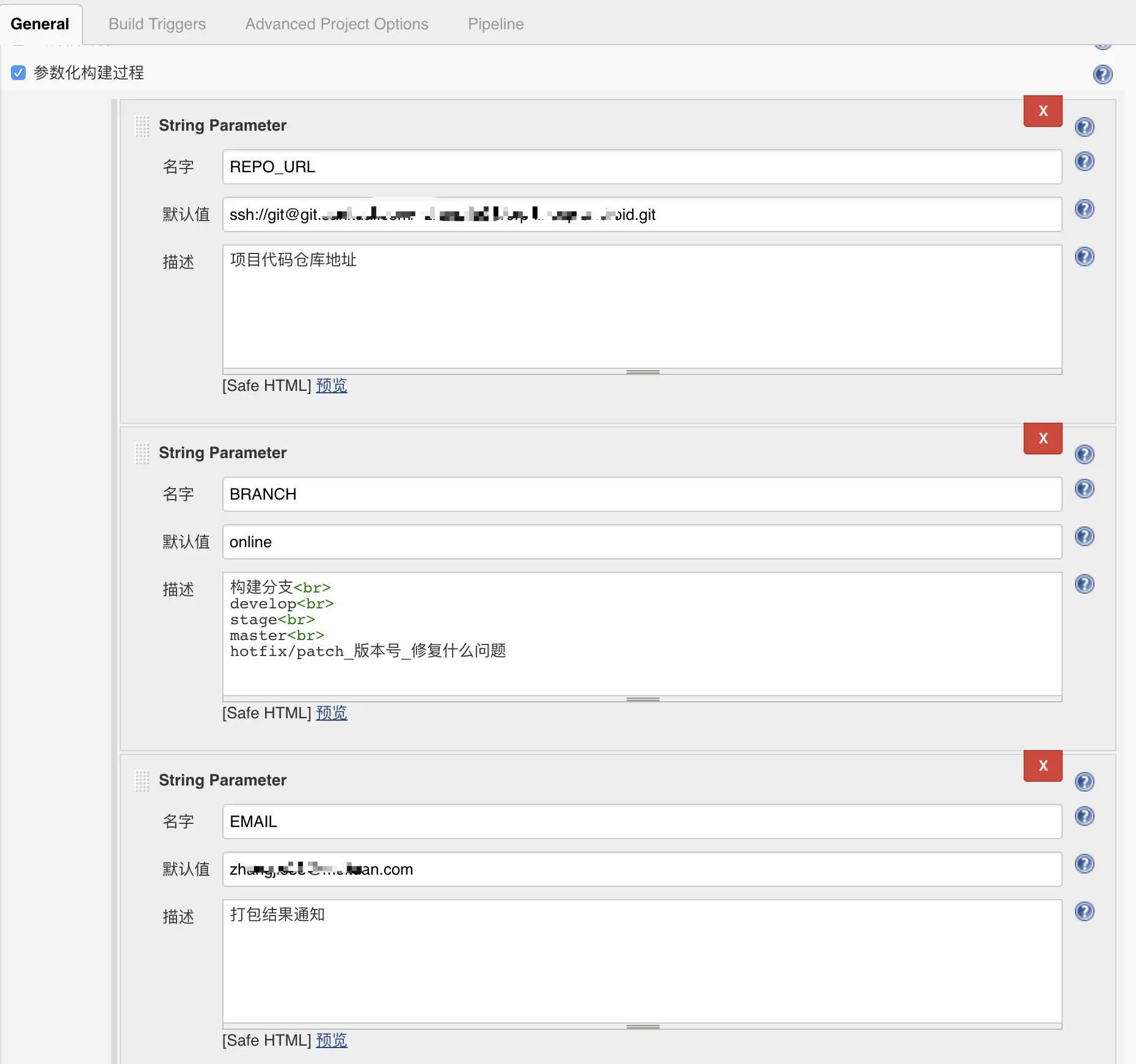 在配置job的时候,选择参数化构建过程,传入项目仓库地址、分支、构建通知人等等。还可以增加更多的参数 ,这些参数的特点是,可能需要经常修改,比如灵活选择构建的代码分支。