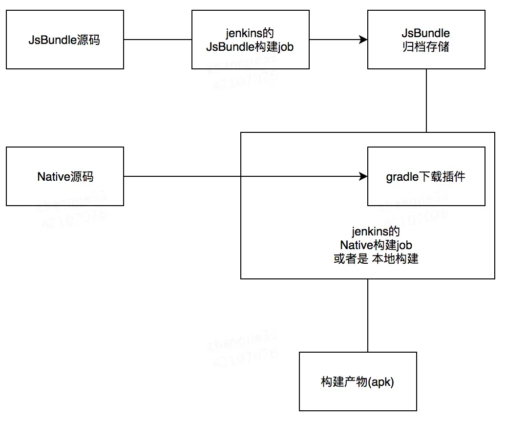 当然,如果有项目集成了React Native,还需要构建JsBundle。在Native修改以后,JsBundle不一定会有更新,如果是构建Native的时候一起构建JsBundle,就会造成很多资源浪费。并且直接把JsBundle这类大文件放在Native的Git仓库里,也不是特别合适。