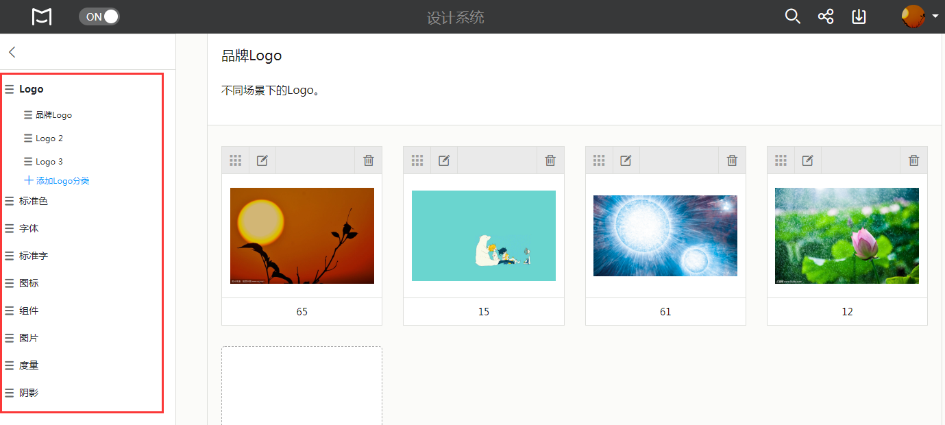 比如,摹客设计系统封装了Logo, 标准字,字体,标准色,图标,图片,度量,阴影以及组件等九种设计规范模块, 方便设计师们创建更加规范统一的Web或APP 产品。如图: