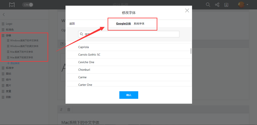 比如,摹客设计系统不仅支持丰富的图片格式上传(例如PNG, JPG, JPRG, GIF, SVG等常见图片格式),还提供了强大的Google和系统字体库,能够轻松帮助设计师定制符合公司和产品特色的设计规范体系。如图: