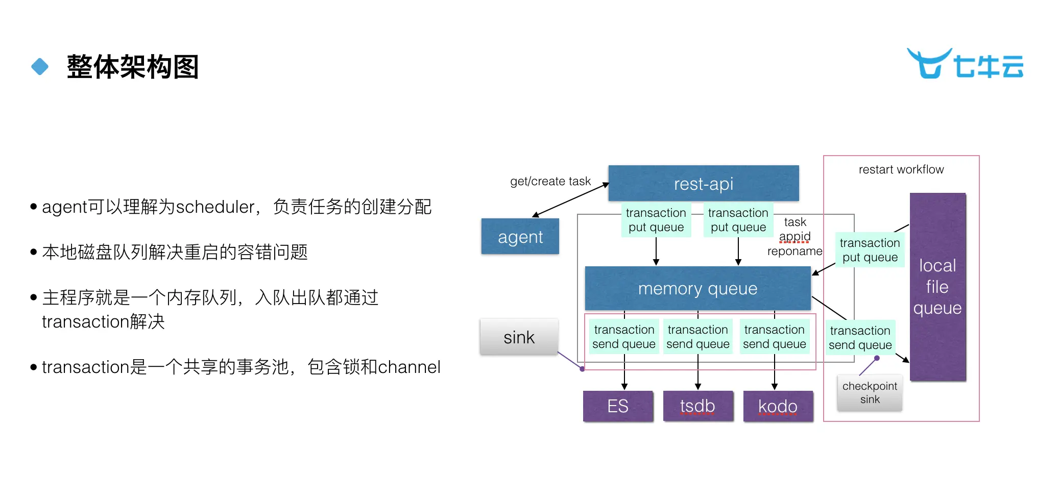 传输队列的实现是基于内存队列和本地文件队列,这就跟 Flume 的 Channel 是相似的概念。但是在实现的过程中,还对它做了一些额外的分装。首先是 agent 组件,agent 可以理解为 scheduler 组件,它负责任务的创建和分配;第二个是 transaction 事务池,这个内存队列的入队和出队,都是通过 transaction 的事务池去处理的。为什么这里要用事务的概念?因为我们在写入 ES 的时候,如果写 200 条数据,会告诉我们有 150 条数据写进去了,有 50 条数据没有写进去,它不会区分是哪 50 条没有写进去。所以说,在这里使用 transaction 的意义就在于,如果真实的情况下,我们遇到这种情况,可以这 50 条数据重新发回 memary queue 里面,让内存队列继续写这 50 条数据。