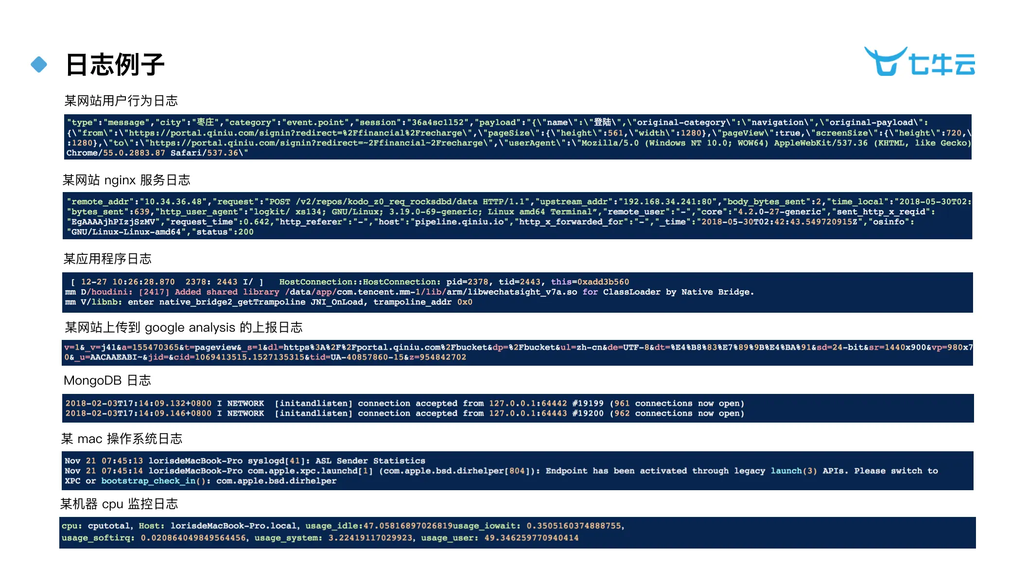 上图列举了一些日志的例子,方便大家了解日志 概念,这里简单解释一下前两项。