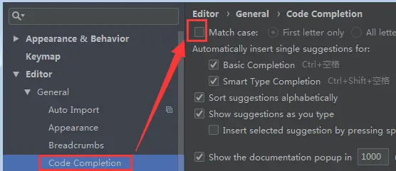 点击菜单栏File --> Settings --> Editor --> General --> Code Completion --> 在 Case sensitive completion 后面的选项改成NONE:进行模糊匹配。(First Letter:根据首字母进行匹配)
