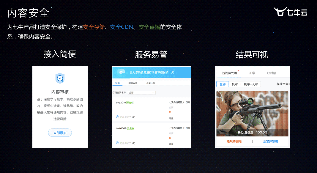 对此,姚唐仁表示,「一定要坚持七牛云多年来的理念——简单,可信赖。七牛云内容审核已全面融合鉴黄、鉴暴恐和敏感人物识别接口,客户一键即可接入,操作十分简单,而背后的复杂算法和专业处理留给我们。」