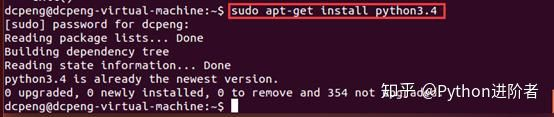 2、这里以Python3的安装为例,直接在Ubuntu14.04系统命令行中输入安装命令:sudo apt-get install python3.4。务必要指定Python的版本,如果想安装Python3.5、Python3.6的话,就把安装命令换为sudo apt-get install python3.5、sudo apt-get install python3.6即可。安装过程一般很快,如下图所示。