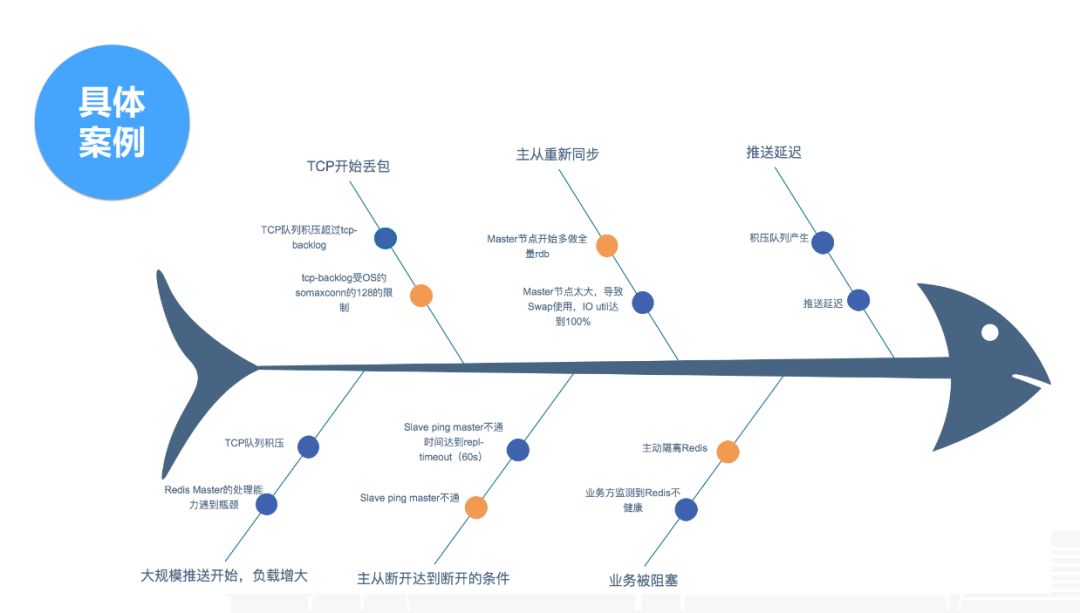 第一个案例是一次主从重置。这个情况是在春节前两天出现的,春节前属于消息推送业务高峰期。我们简单还原一下故障场景。首先是大规模的消息下发导致负载增加;然后,Redis Master压力增大,TCP包积压,OS产生丢包现象,丢包把Redis主从ping的包给丢了,触发了repl-timeout 60秒的阈值,主从就重置了。同时由于节点过大,导致Swap和IO饱和度接近100%。解决的方法很简单,我们先把主从断开。故障原因首先是参数不合理,大都是默认值,其次是节点过大让故障效果进行放大。