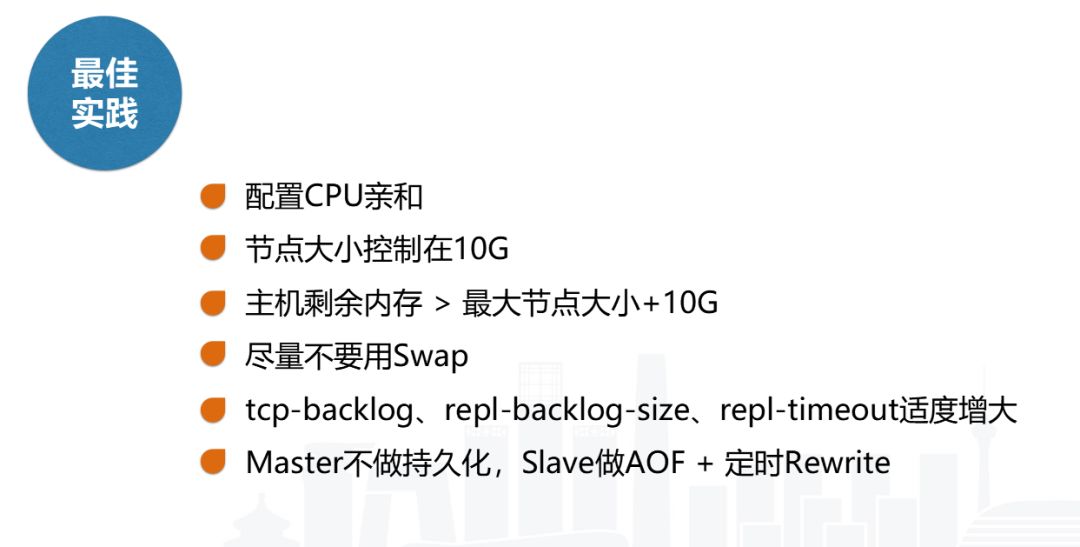 1、repl-backlog-size太小,默认是1M,如果你有大量的写入,很容易击穿这个缓冲区;2、repl-timeout,Redis主从默认每十秒钟ping一次,60秒钟ping不推就会主从重置,原因可能是网络抖动、总节点压力过大,无法响应这个包等;3、tcp-baklog,默认是511。操作系统的默认是限制到128,这个可以适度提高,我们提高到2048,这个能对网络丢包现象进行一定容错。