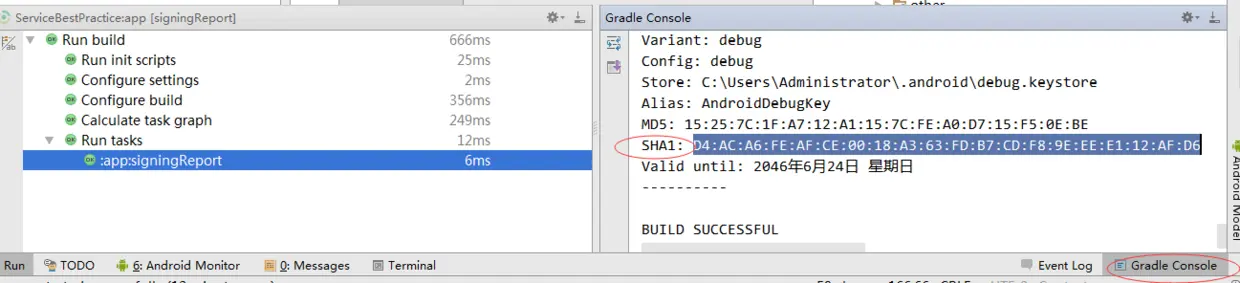 执行成功后,点击右下角的【Gradle Console】标签,可以看到生成的 SHA1 码: