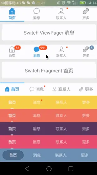 CommonTabLayout继承自FrameLayout,类似于一个RadioGroup,可以在xml布局中设置commonTabLayout的布局特性;另外也可以在代码中设置未读消息、消息数量。如果要和fragment绑定,实现fragment的切换需要手动通过fragmentManager来管理切换;viewPager也是同理;也可通过fragmentPagerAdapter实现fragment和viewPager的绑定;