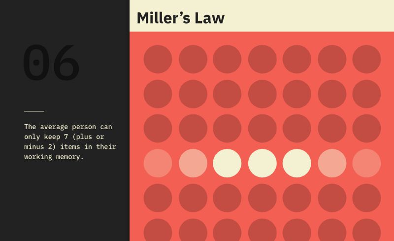 根据这项法则,人们可以记住他们工作记忆中最多7种不同的元素。这就是为什么网页中的选项和导航菜单或多或少都基于此数目。拥有超过7个元素会产生混淆和用户失去焦点,他们不再能够记住他现在正在寻找的选项。