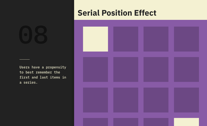 根据这项定律,在一系列元素中,用户将始终更能记住第一个和最后一个。这就是我们在应用程序导航栏中看到最重要的操作位于左侧或右侧的原因,引入了诸如start或profile之类的元素,并考虑了系列位置。