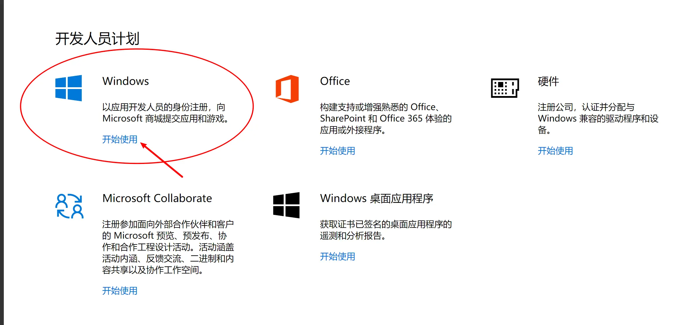 开发人员计划中的Windows,然后点击开始使用(如下图),跳转到注册页面进行注册。微软开发者账号是一次性收费,费用可能 160 RMB 左右(我记不得了)。其余的详细注册细节就不赘述了,百度也都能找得到。