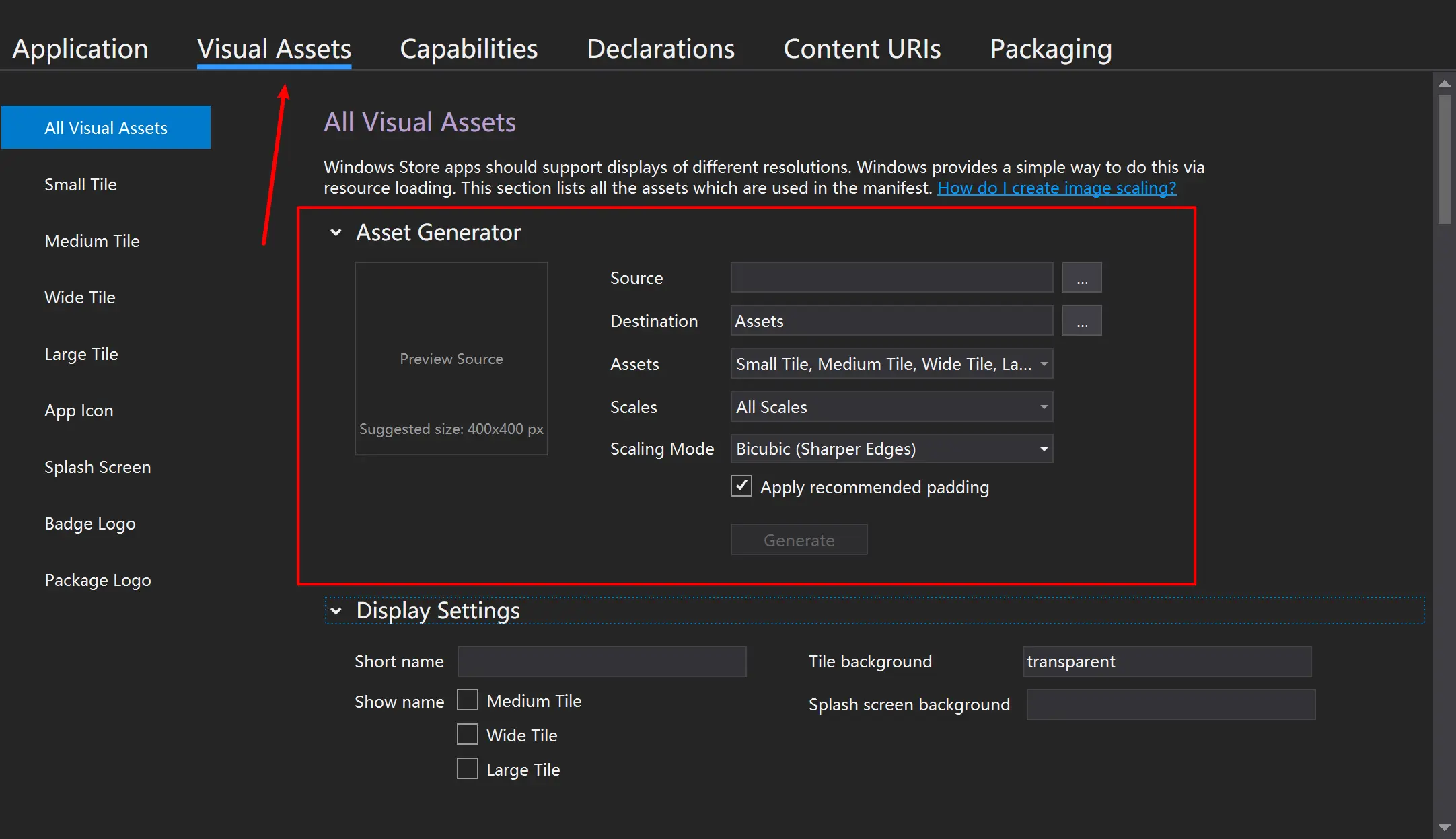 Visual Assets中。这里面就是软件的图标与磁铁所使用的图片。在刚开始新建项目的时候,vs 会自动帮我们创建一些文件,但是在发布之前我们需要使用自己的图案,不然是过不了审核的!在All Visual Assets中,找到Asset Generator,点击Source后面的三点按钮选择你的图标后,vs 会自动帮你生成相应的各个尺寸的图标。当然你可以自己更改。 -