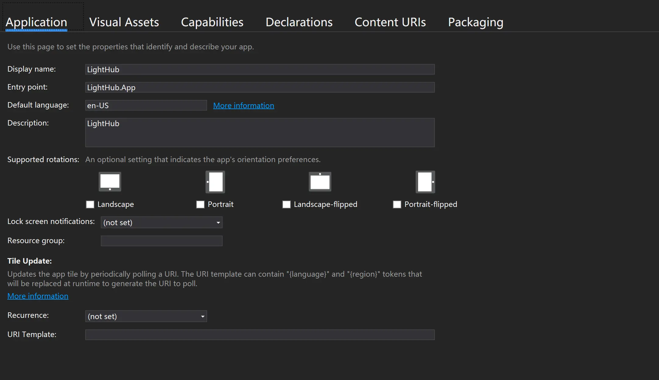 Application中可以看到如下图所示,其中Display name就是软件安装在电脑上后显示的名字。Default language就是默认的语言,如果你的软件默认语言不是美式英语,那就更改这一项。Description便是对于应用的表述,但是这个描述是当你把安装包发给人家进行旁路加载时,会出现的,并不是上传到商店后的介绍。其余剩下的暂时就放着不用去更改。 -