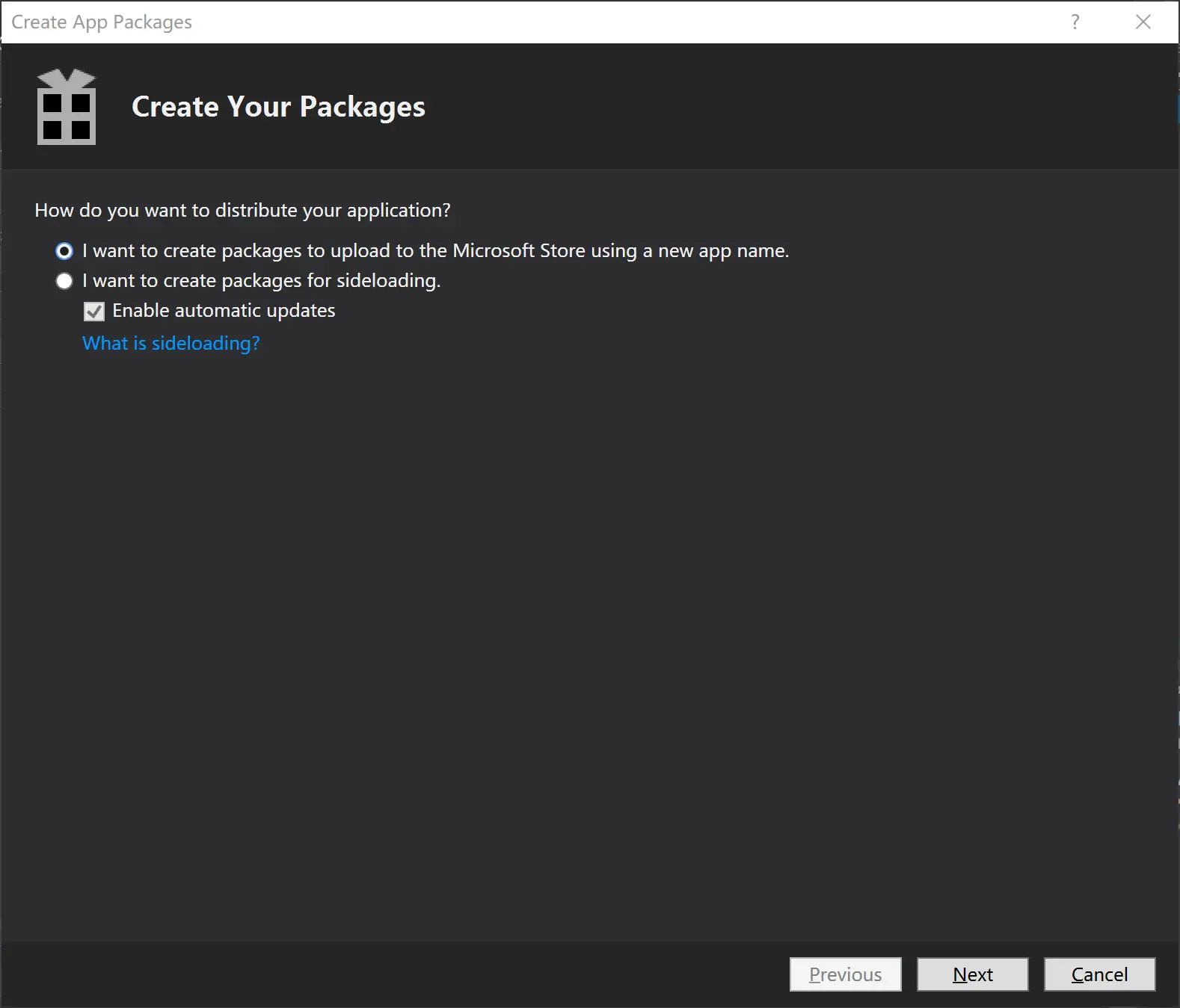 可以看出这里有两个选项,第一个选项会同时创建用于旁加载的安装包和用于上传应用商店的包,而第二个选项只会生成旁加载的包。这里我们演示第一个,然后点击下一步,如果你的该应用是第一次创建包,那会出现下图(其实就是第一步的关联):