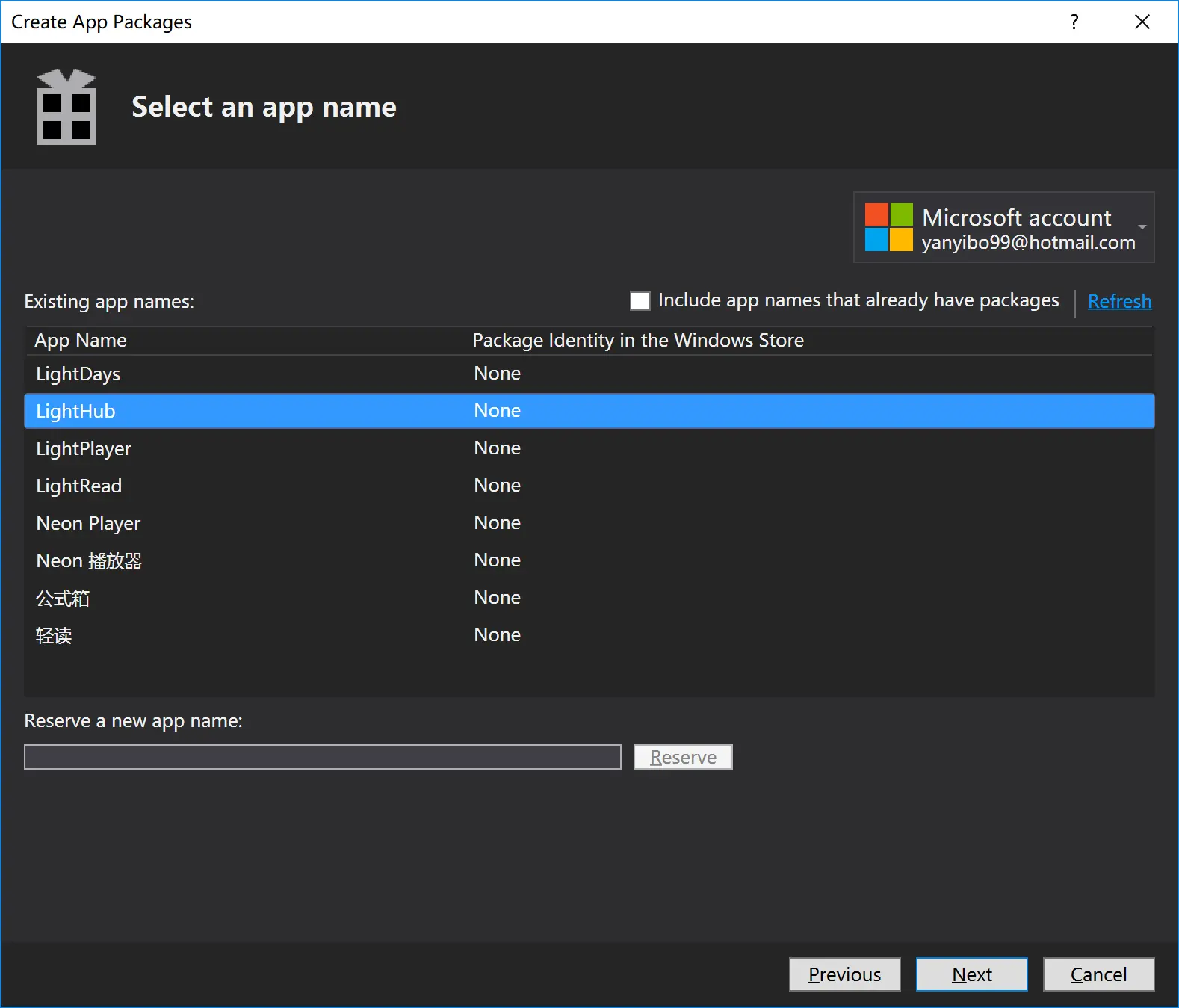 **提示:**在打包的过程中,我们也可以在 Visual Studio 中进行名字预留。但一般情况,我们当然都是先把名字占着咯,说不定以后被别人注册了呢。