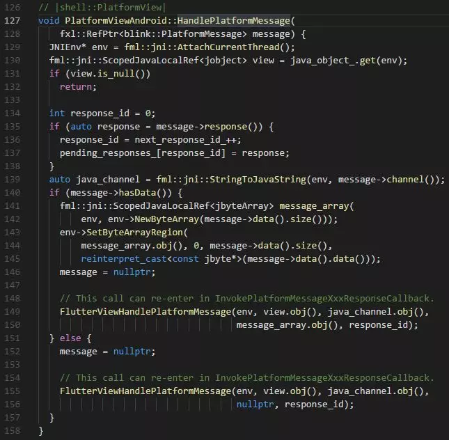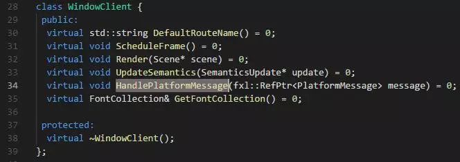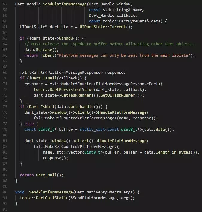 这段代码比较长,我们一点点来看。 首先看64行,可以获取到一个有用信息,这个套机制仅能在主线程(isolate)上运行。 然后看最关键的方法: dart_state->window()->client()->HandlePlatformMessage()