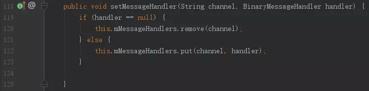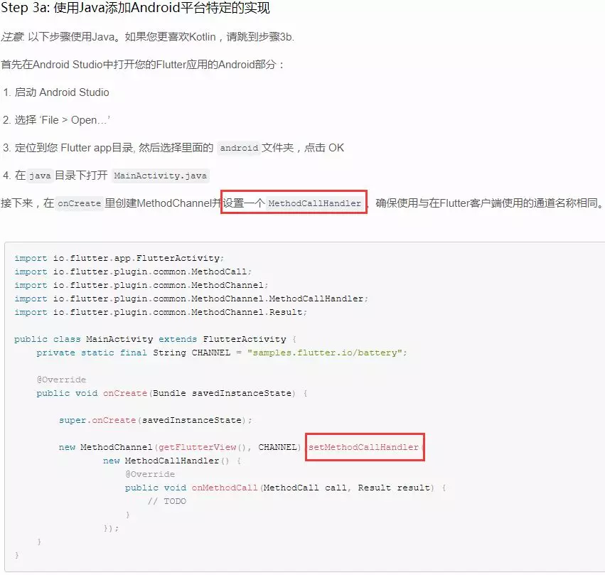 果然是一个抽象函数,而且有三个实现。那么我们就不能乱猜了,再回头看一下 handler这变量到底是个什么类型。从133行可以看到 handler 是以channel的name为key从一个map( mMessageHandlers)中取出来的,那这个值是在哪被设置的呢?线索仿佛到这就断掉了。别急,我们先来回忆一下,使用 MethodChannel的步骤。(下图为中文官网教程截图)