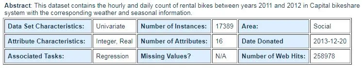 说句题外话,这个共享单车数据集是在2011年至2012年间收集的,此处的共享单车是采用固定桩形式的单车,类似于中国的永安行,并不是我们目前所看到的满大街的小黄车,小蓝车,摩拜之类。