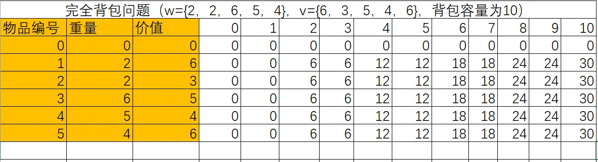 这相当于什么意思呢,相当于二维数组的时候更新的时候dp[i][j]=max{dp[i-1][j],dp[i][j-w[i]]+v[i]},也就是每次更新的值依赖于前面的值,而不是dp[i-1][j-w[i]]+v[i],也就是可以重复放入一个物品,如果使用二维数组解决上面的例子的完全背包问题,我们会得到这样一个状态数组。可以看到,第一个物品被重复放了5次。
