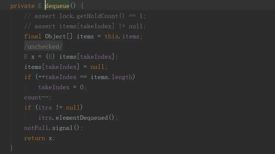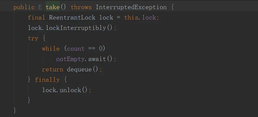 take方法的过程是相似的,加锁后判断队列是否为空,如果为空的话,使用notEmpty阻塞,等待被唤醒,被唤醒后如果队列不为空,调用dequeue方法出队,在出队后唤醒notFull
