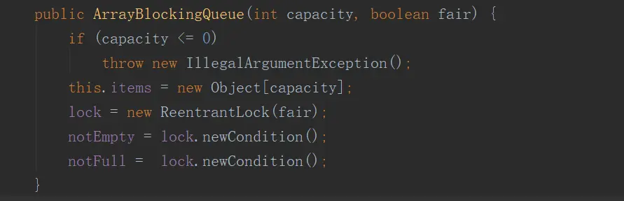 我们重点来看put和take方法的阻塞实现,他们使用了可重入锁ReentrantLock,并且使用Condition来控制入队和出队线程。如图,ArrayBlockingQueue的构造方法会初始化ReentrantLock,并且会初始化两个Condition对象。