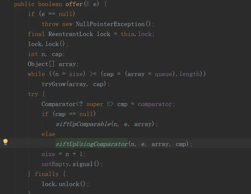 put方法直接调用了offer方法,其有几个关键步骤,首先判断是否需要扩容,使用tryGrow方法进行扩容,插入阶段调用siftUpComparable或者siftUpUsingComparator进行堆的上滤调整,最后唤醒notEmpty