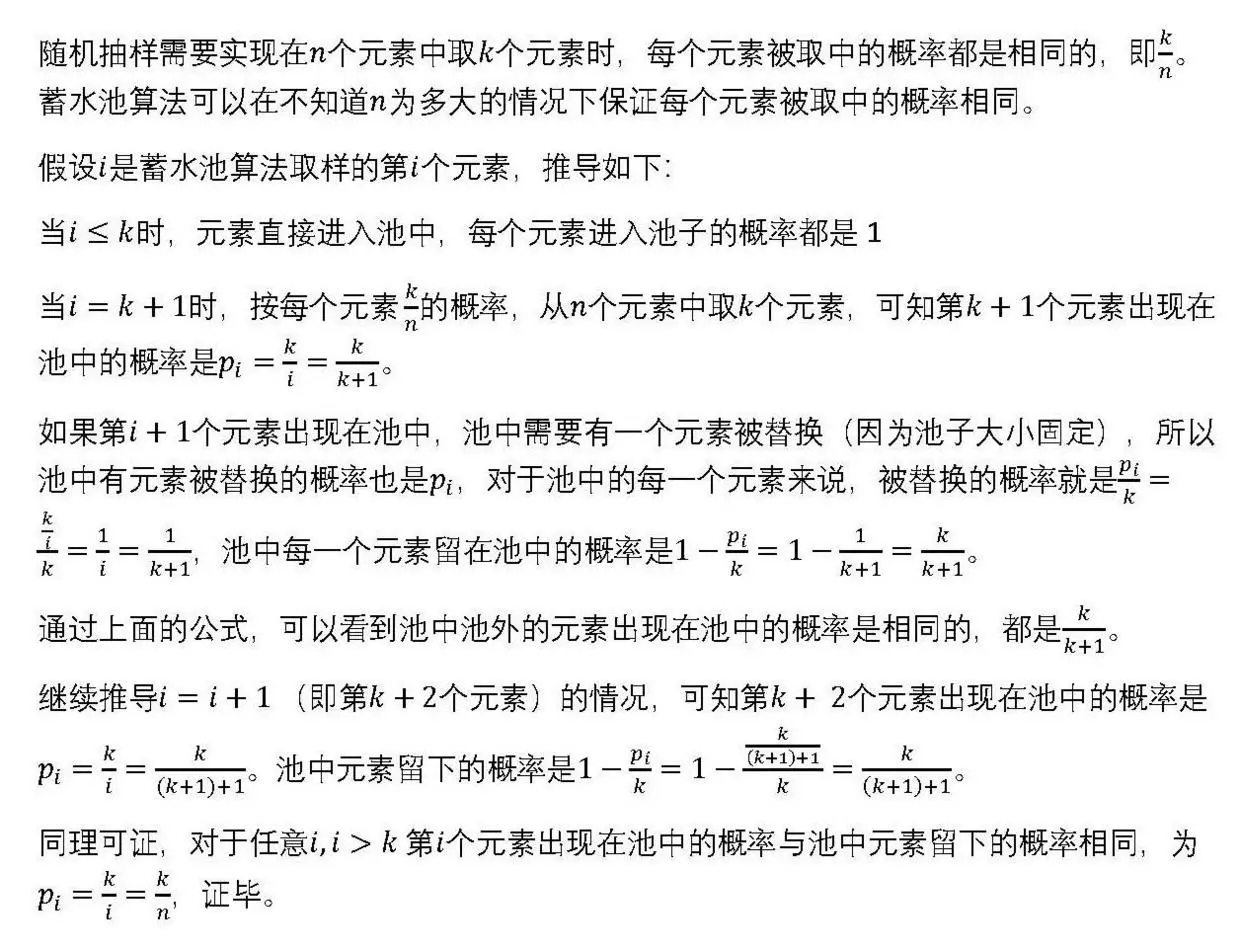 游泳池(蓄水池)大家都不陌生,有些游泳池中的水是活的,有入水管也有出水管,那么和泳池体积相当的水流过之后,是不是泳池中所有的水都会被替换呢?当然不是,有的水在泳池中可能会存留很久,有的可能刚进去就流走了。仿照这种现象,蓄水池抽样算法诞生了,蓄水池算法的关键在于保证流入蓄水池的水和已经在池中的水以相同的概率留存在蓄水池中。并且蓄水池算法可以在不预先知道总量的情况下,在时间复杂度O(N)的情况下,来解决这类采样问题。