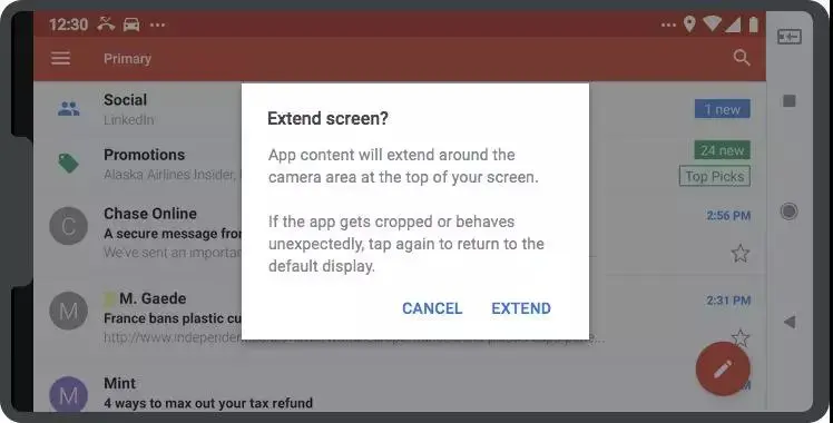 在某些运行 Android 8.1 (API 等级 27) 或更早版本的设备上,用户可以通过开启 "特殊模式",允许系统在全屏或横屏模式下延伸应用窗口至缺口区域。用户一般可以在导航栏中找到并勾选该模式,接着系统会弹出一个确认对话框,在征得用户同意后,模式才会正式生效。