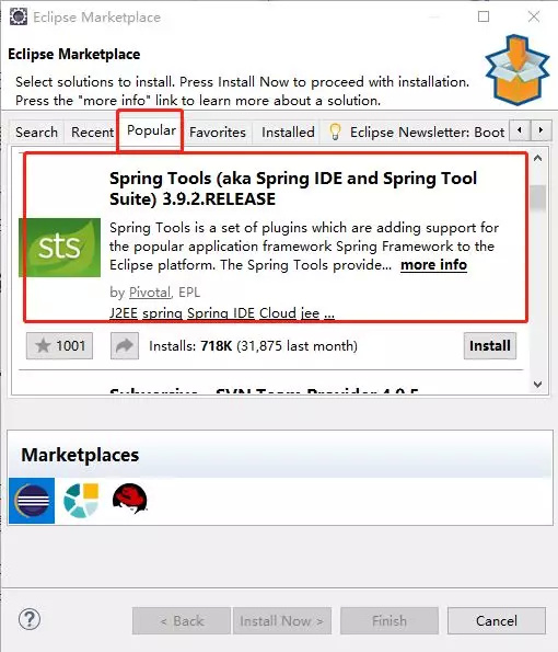 首先找到Eclipse的菜单Help→Eclipse Marketplace,打开这个菜单后,可以看到一个新的窗口,然后选择标签页Popular,从中找到Spring Tool Suite(STS)的插件,如图1-1所示。