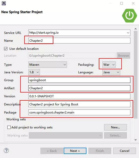 同样,图中加框的地方是我根据自己的需要进行修改的内容。注意,这里还是选择了以War打包的形式,然后点击Next,又到了可以选择starter的窗口,如图1-8所示。