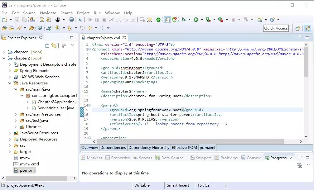 从图1-5可以看到它是一个Maven项目,其中pom.xml文件已经建好,而且给我们创建了带有main方法的Chapter2Application.java文件和初始化Servlet的ServletInitializer.java文件。这里通过Chapter2Application就可以运行Spring Boot工程了。下面再打开工程中的pom.xml文件,就可以看到这些代码,如代码清单1-1所示。