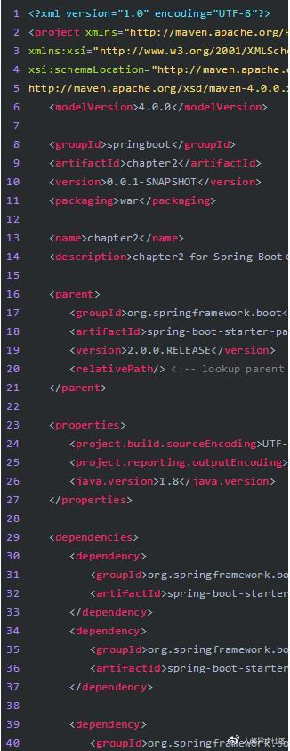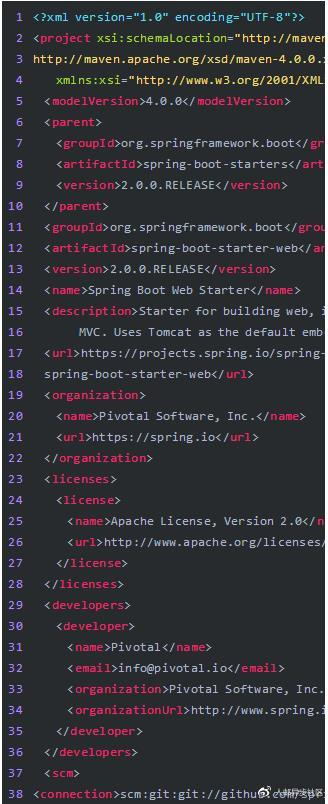 这里先谈spring-boot-start-web的内容,未来还会谈到spring-boot-autoconfigure文件夹的内容,所以图 1-10 中一并加了框。打开spring-boot-start-web文件夹,就可以看到一个名为spring-boot- starter-web-2.0.0.RELEASE.pom的文件,打开它就可以看到代码清单1-2所示的代码。