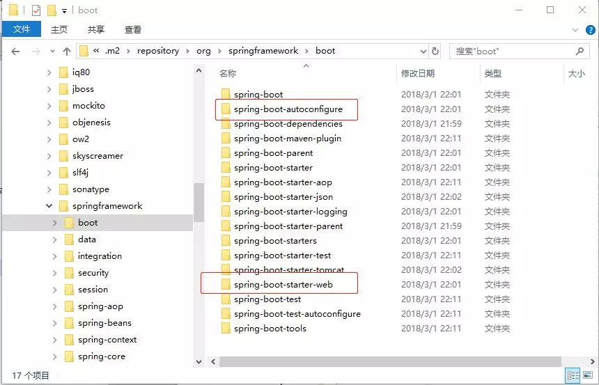 下面以最常用的Spring MVC为例进行说明。首先打开Maven的本地仓库,找到对应Spring Boot的文件夹,可以看到图1-10所示的目录。