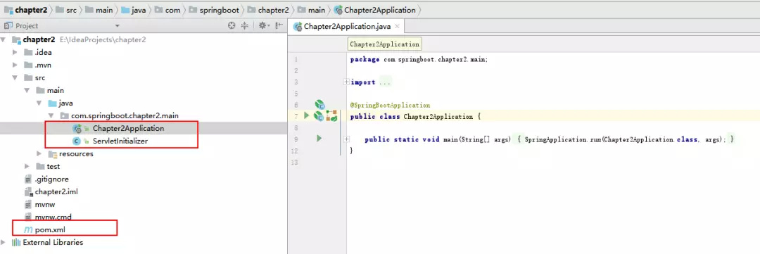 你也可以看到一个建好的类Chapter2Application、ServletInitializer和Maven的pom.xml文件。运行Chapter2Application就可以启动Spring Boot工程,而pom.xml则配置好了你选中的starter依赖,这样就能够基于IntelliJ IDEA开发Spring Boot工程了。