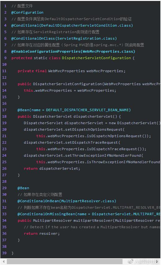这里可以看到存在很多的类,其中加框的类DispatcherServletAutoConfiguration就是一个对DispatcherServlet进行自动配置的类。因为本书不是源码分析的书,所以不对注解这些内容进行深入的探讨,只是截取DispatcherServletAutoConfiguration源码中的一个内部类DispatcherServletConfiguration对Spring Boot的自动配置做最基本的讲解,如代码清单1-3所示。